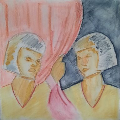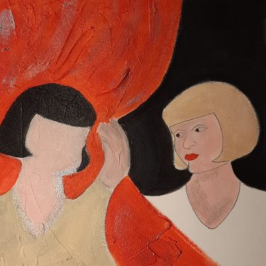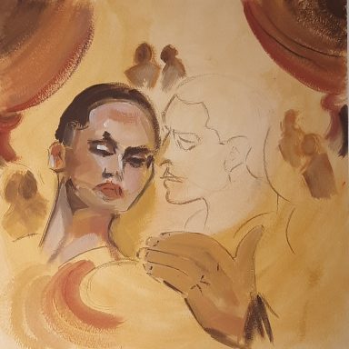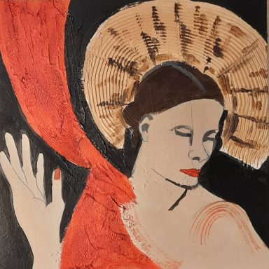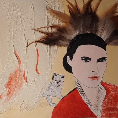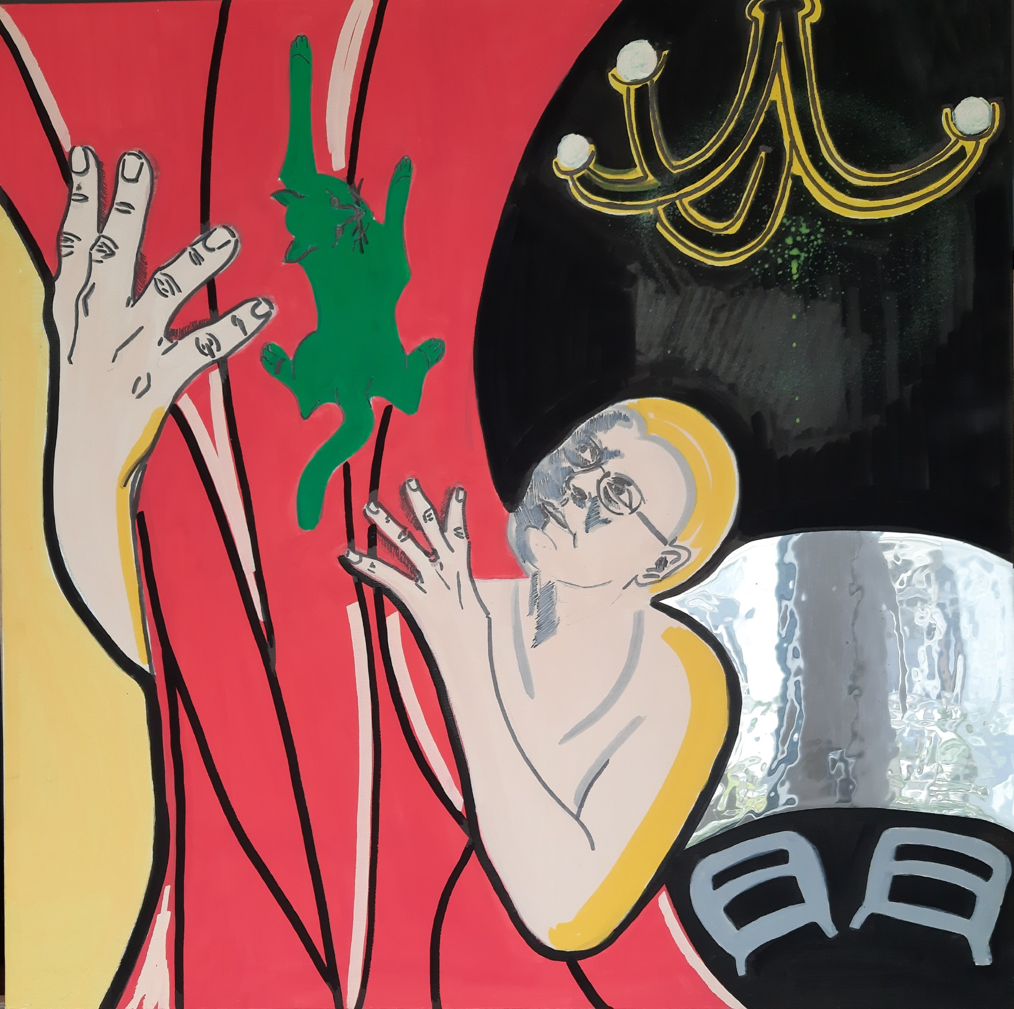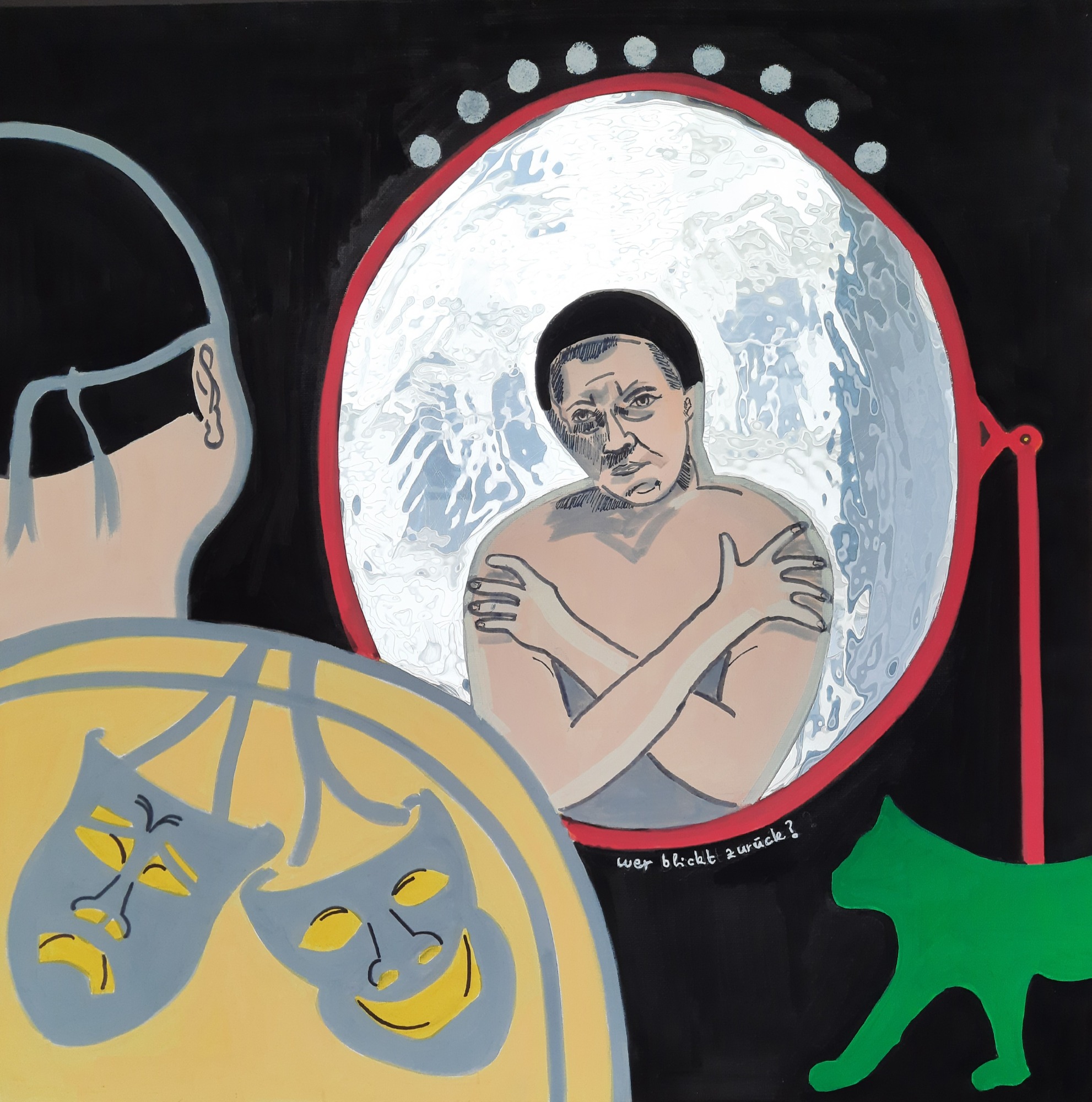 Mit schwunghaften Linien und einer reduzierten Auswahl an kräftigen Acrylfarben, Tusche und Spiegelfolie auf Leinwand wird die Bühne der Welt aus der Perspektive der Schauspielerin dargestellt.