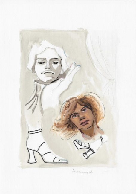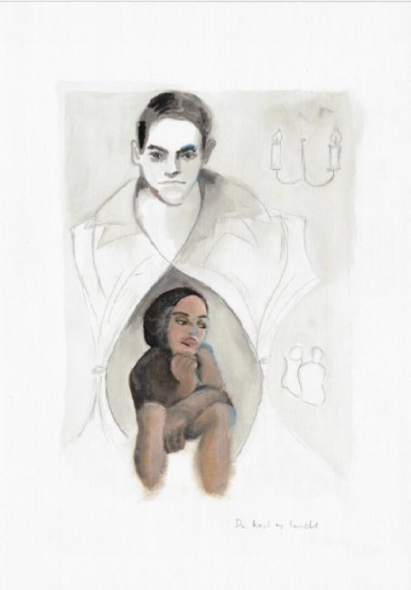 Die fließende schwarze Tusche verleiht den Bildern Leichtigkeit, lässt aber Raum für die eigene Phantasie. Gleichzeitig zeigen die Gestalten, in gedämpften Ölfarben gehalten, eine andere Perspektive und stellen die schwarz- weißen Grundgedanken in Frage.